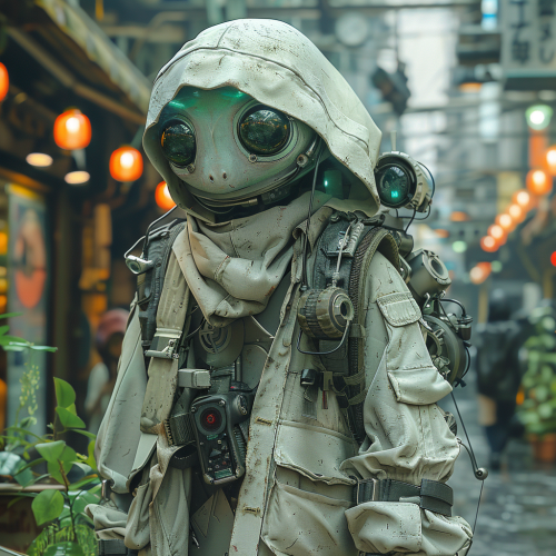 Half-man, half-caméléon Anime-cyberpunk style Green skin Bulbous eyes Wearing a tattered hoodie Cargo pants Sneakers Backpack Earpiece Carrying a small cybernetic device --s 750