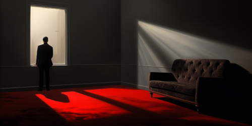sunray trought the window , a lonely man sitting on a black coach, in a grey living room with red carpet realitistic --ar 2:1