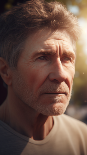 A realistic portrait of Michael Edward McQuaid at the age of 40. He was born on August 15, 1975, in Columbus, Ohio. Michael is a Caucasian man with a moderately athletic build, standing around 5'10". He has short, slightly wavy brown hair, with some graying at the temples, and hazel eyes. His face has a few fine lines and a well-groomed stubble. He's wearing a casual button-up shirt with the sleeves rolled up and jeans, with a warm, approachable expression. The background suggests a suburban setting in Ohio, with soft natural lighting.