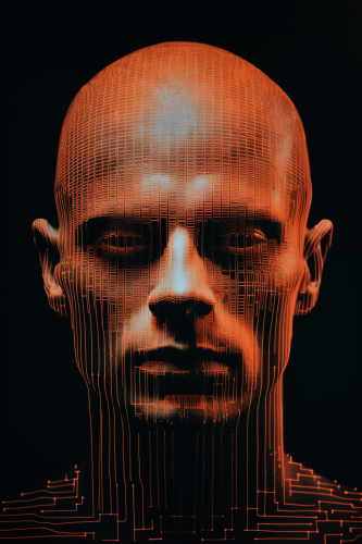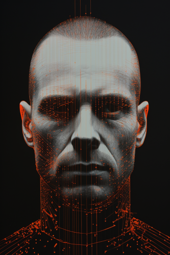 A man's head is seen from the front, wearing a white shirt with orange lines, against a black background. The portrait has a soft focus style, with glowing light and shadow effects, giving it a dot matrix art or minimalist portrait aesthetic. The image has the appearance of a risograph print or flat painting created using riso printing techniques .