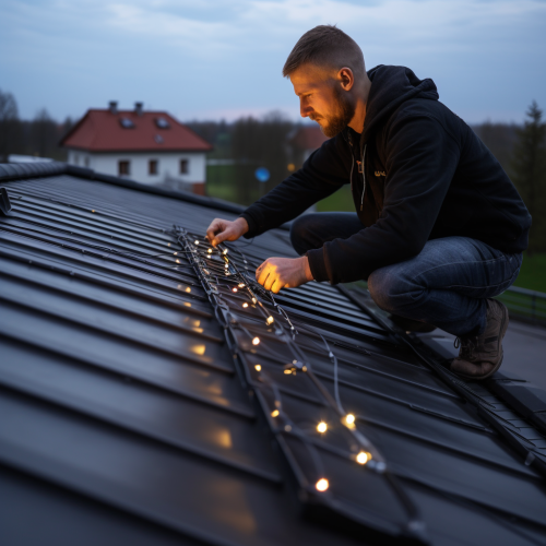 the installer hangs an LED strip on the roof of the house, super realism, high quality