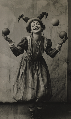 Within a bustling circus tent, juggling with balls made of floating confetti. Michelangelo-style artwork, portraying the act with robust muscle representations, an idealized human form, dynamic poses, and a hint of dramatic flair. Inspired by the sculptor, the painting introduces a distinctive approach to capturing three-dimensionality on the canvas.