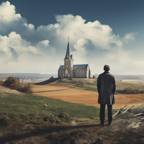 Photorealistic, highly detailed image of a 42-year-old beer gut man standing outside a church. He is tall, with a thick build and a bit of a paunch. He has dark, thinning hair with a receding hairline and blue eyes. He is clean-shaven, dressed in a button-down shirt, shoes, and slacks for church.