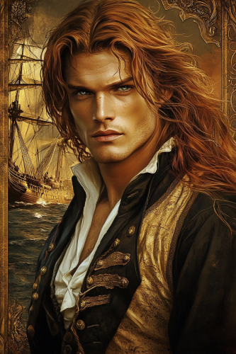 imagine the cover of a romantic novel about a pirate; in the center of the cover, an attractive man in his thirties, long red hair, gray eyes, dark skin, dressed like a 17th-century pirate; the image is bordered by scrolls; in the background, a three-masted French merchant ship from the 18th century; the mood is said to reflect the adventure/romance side of the story; --ar 2:3