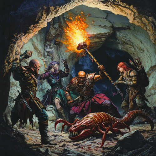 a group of five adventurers is battling a giant scorpion in a dark cave. One of the adventurers holds a torch in the background which is the only source of light. A human monk who is bald and wears maroon robes, battles the scorpion in front with a shortsword and fists. A male dwarf with brown hair and beard in armor wields a war hammer, a half elf in armor can be seen in the background with an unknown weapon, and a red-headed young human female with wavy red hair is also in the background casting a spell and elven archer can be seen firing arrows at the scorpion in the background.