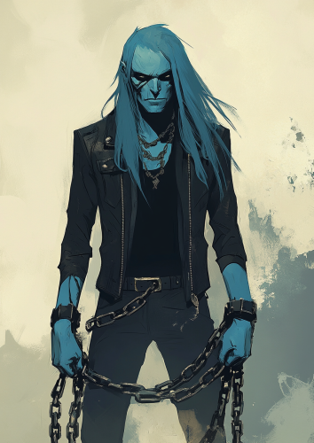 a cartoon sketch showing a blue-skinned man with long hair, wearing a black leather jacket and dark pants. Large chains are wrapped around his neck. The background is a simplistic sketch of mold. --ar 5:7 --v 6.1