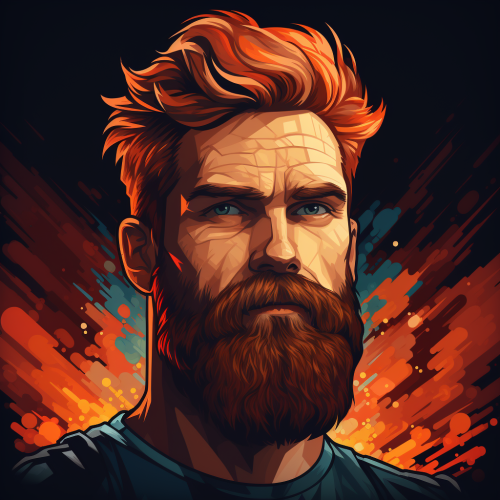 a cartoon image man in his 30's with a long red beard, and orange red hair on the sides, but balk on top. simple, minimul, pixelated --s 250