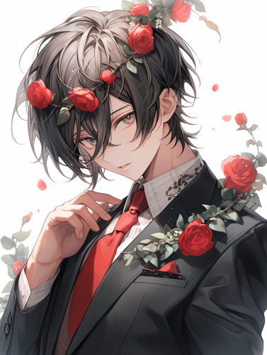 man with dark short hair with Red roses accessories in his hair, suit --niji 5 --ar 3:4