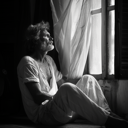 Middle-aged man in long pants sitting by a window on a hot summer day, viewed from side profile, cinematic black and white, documentary style, fan blowing curtains, dramatic lighting, emotional atmosphere, film grain, ultra detailed --ar 1:1 --v 6.0 --s 250