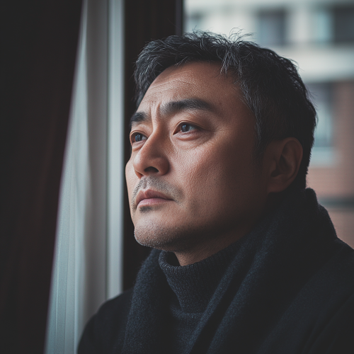 Man looking out window feeling watched