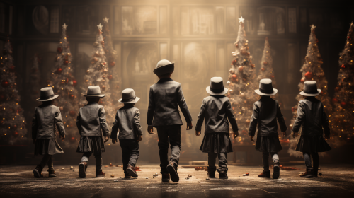 Eccentric and quirky children performing a Christmas dance. Festive stage backdrop. They are meticulously posed and positioned in a minimalist symmetrical setting. Black and white with vibrant color splash. Vibrant hues. Tapestry of whimsy. nostalgia with a dash of quirky charm. Shot with a Pentax. K - 3 III Monochrome. Santa hats. Christmas tree in background. Presented in art style. Extreme close - up camera angle. Very close. Low angle camera shot. Looking straight up, Blurred background. Bakeh elements. High - end. Very Stylish. Black and white photograph. --ar 16:9 --q 0.5 --s 750