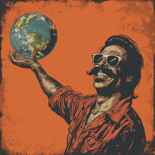 generate the image of a man wearing sunglasses, with a long black mustache, smiling, holding the planet earth in his right hand --v 6.0