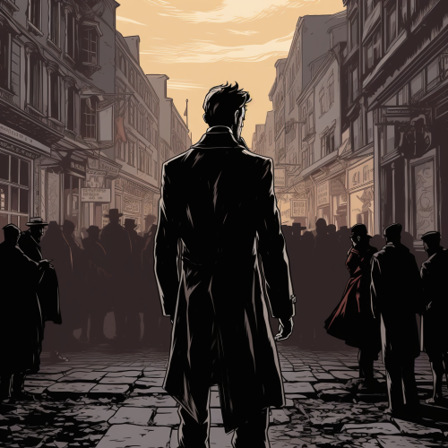 far away overhead shot, man with hat walking through busy city in 1860's russia, style by black and white noir comic boo