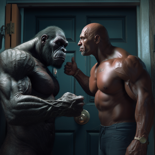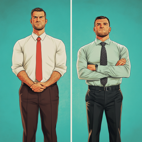 two images, one half be a masculine over 6ft tall man looking proud, on the over have a wimpy and short man looking sad, make them cartoonish but also campaign ad