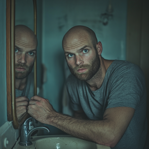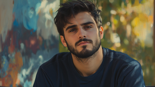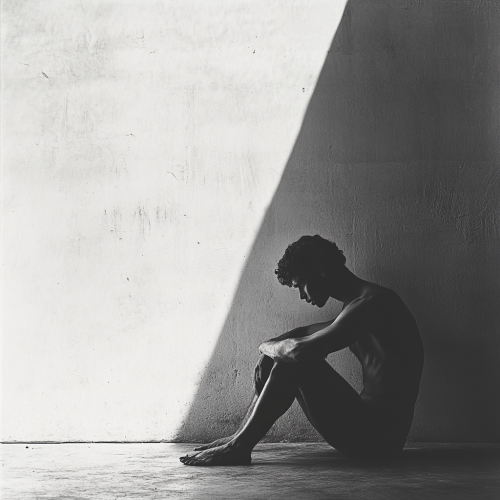 A man sitting with his head down, wearing a melancholic expression, with a long shadow cast behind him. Emotional black-and-white imagery. 1:1 aspect ratio. --s 250