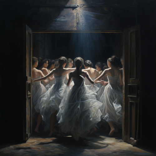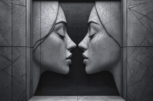linear axonometric perspective environment, two large doors, the outline of one of them is a man face, the other one is a female face that fits together like if were kissing between them, hdr, highly detailed, style raw --chaos 10 --ar 3:2 --v 6.1