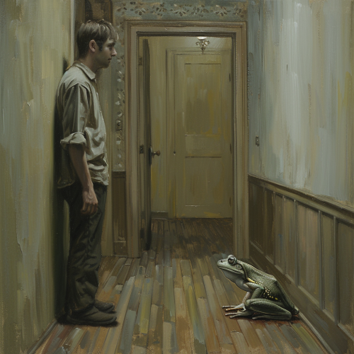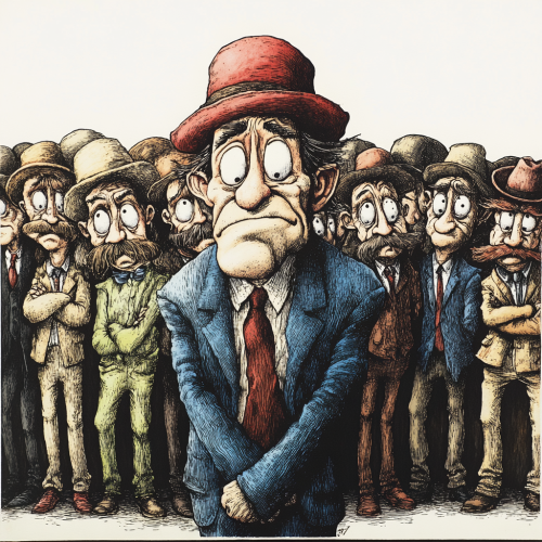 We see a sad, small, thin, weak man. He is surrounded by people looking down their noses on him, judging him, finding him wanting. They disdain him because he is weak. Full color. Style of R. Crumb. Weird. --chaos 15