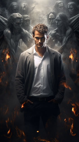 uhd incredible portrait of a man standing in front of angels creepy horror atmosphere 4k realistic high quality high details --ar 9:16