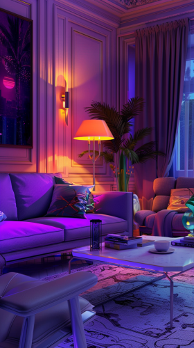 cozy luxury living room interior, neon purple, hyper realistic --ar 9:16