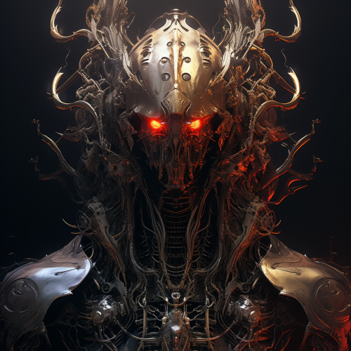 biomechanical demonic man who are part robot part man part demon and wearing ornate armor and cloaks + horror+ art style of Brom, whelan, aly fell rutkowski, art germ, giger, beksinski, rossdraws, and franzeta + art station + ultra detailed + hyper realistic + cinematic scene + 8k --v 5.2