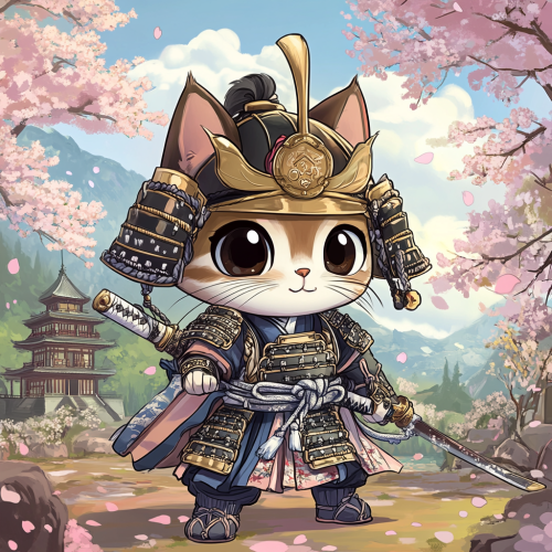 A cute chibi cat dressed in traditional samurai armor. The cat wears a detailed, intricately designed armor with a flowing, colorful kimono underneath. It has a small, elegant helmet with a crest, and holds a miniature katana with a graceful pose. The background features a serene Japanese landscape with cherry blossom trees and a tranquil temple, enhancing the cat’s samurai charm and honor. 4K, HDR, highly detailed