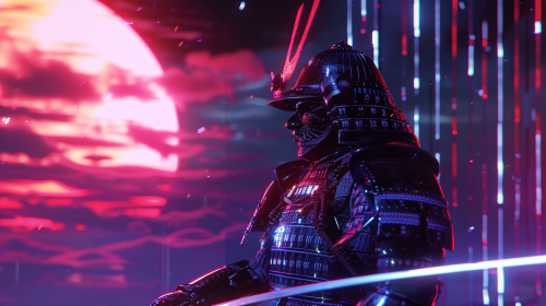 In a high-tech dojo, a cyber-samurai clad in traditional armor merged with futuristic technology stands ready for battle against a vivid holographic sunset. The scene is charged with tension, the air vibrating with the anticipation of a duel that blends ancient honor with modern warfare. Created Using: holographic technology, traditional armor design with futuristic enhancements, dynamic lighting, vivid color contrasts, atmospheric tension, cultural symbolism, action pose, digital illustration --ar 16:9 --v 6.0
