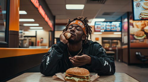 A realistic photograph of a man in his twenties in a simple makeshift pirate halloween costume, looking tired but content with eyes closed, sitting at a table inside a Burger King in the middle of the night. He is happily biting a burger, surrounded by the fast-food decor. The lighting is warm and inviting, capturing the late-night vibe. He looks very messy and sweaty after a long night of partying. --style raw --ar 16:9