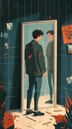 Illustration d'un homme avec une attitude égoïste, représenté dans un style dramatique et symbolique. Il est montré en train de se regarder dans un miroir avec une expression de fierté excessive, tandis que des objets et des éléments autour de lui sont en désordre ou négligés. Son environnement reflète son manque d'empathie, avec des éléments comme des cadeaux personnels entassés et des personnes en arrière-plan semblant délaissées. Le style visuel doit être intense et percutant, mettant en avant l'impact de son égoïsme sur son monde. HDR, 8k, --ar 9:16