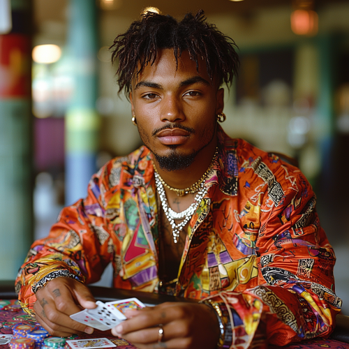 A young man with a slightly goofy, open expression sits at a poker table, holding his cards in front of him, a front of face, with an innocent, unguarded manner. His trendy, streetwear-inspired outfit is full of life, with bright, playful patterns and no dark or brown shades. The photo includes additional space, capturing the poker table with a modest stack of colorful chips and a few scattered cards, adding depth and a sense of casual fun. The background is a soft, pastel gradient in vibrant tones, while the lighting is natural and low in contrast to keep the scene light and inviting. The image is carefully retouched to capture his carefree expression and the lively atmosphere of a relaxed poker night --q 2 --s 750