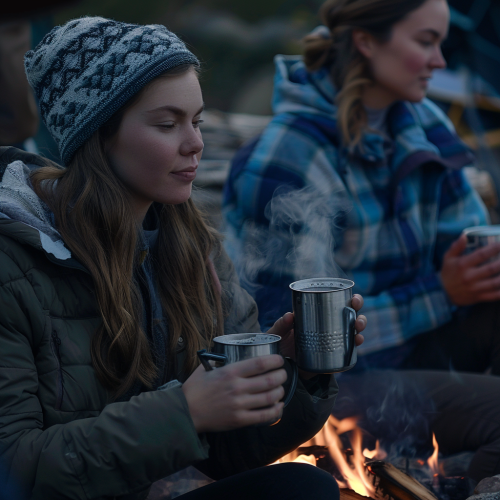 a girl sitting next to a campfire at dusk on a beach in the Pacific Northwest. There are a few sea stacks out in the water and a cave in the distance down the beach. The girl is wrapped in a blanket