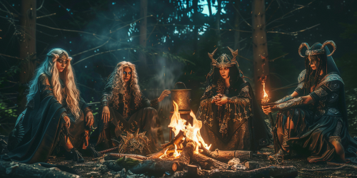 five different goddesses sitting in front of a campfire, first Cailleach a very old woman with long white hair, the second Cerridwen a woman with long black hair holding a cauldron, the third Hecate a robed woman holding two torches, the fourth Hela a half-woman half-dead woman with a black cloak, the fifth Morrigan a wild woman with armor and a horn on her shoulder, captured by Canon EOS R camera with a 50mm f/ 1. 8 lens, f/ 2. 2 aperture, shutter speed 1/ 200s, ISO 100 and natural light, Hyper - Realistic Photography, Hyper detail, UHD, Color Correction, hdr, color grading, hyper - realistic photograph. --ar 2:1 --v 6.0