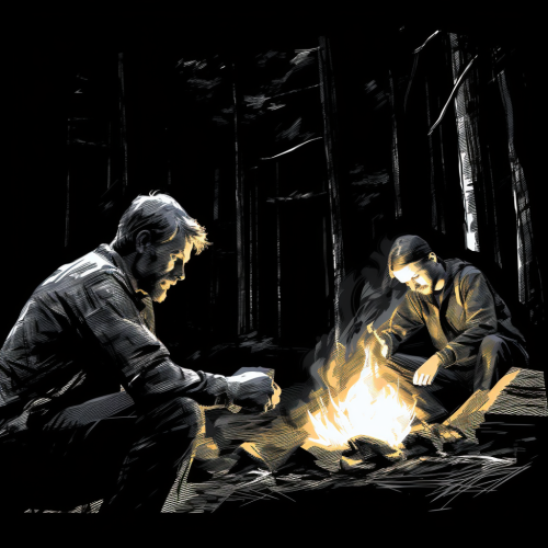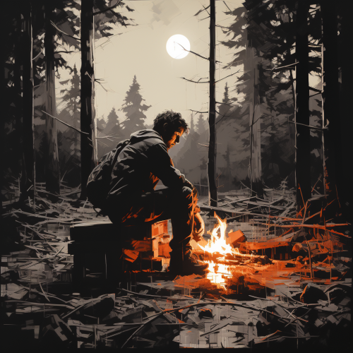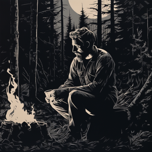 A monochrome ink illustration of a man sitting at a campfire between dozens of tall trees, with the focus being on the man and a piece of firewood in his right hand. Camera is infront of the man. Grey Flames cover the left edge of the lens, and the flame casts shadows on the man and the piece of wood. Simple Artstyle. Forest background. Inside a dense forest. line work. black and white comic book. no shading. Graphic Novel. Sketch.
