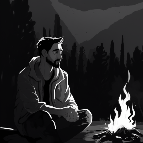 A monochrome drawing of a man sitting at a campfire, with the focus being on the man and a piece of firewood in his right hand. Camera is infront of the man. Grey Flames cover the left edge of the lens, and the flame casts shadows on the man and the piece of wood. Simple Artstyle. Forest background. Inside a dense forest. line work. black and white comic book. no shading. --s 700