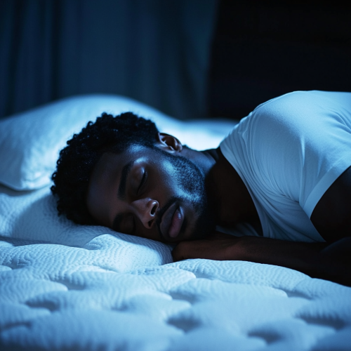 a 32 years old black man sleeping sideways on a mattress, with a comfortable pillowtop wearing a white T-shirt, a pillow under his head, night time lighting