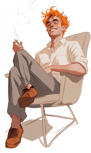 Illustration of a smiling man sitting in a simple chair without an armrest and crossing his legs. The young, cool man holds a cigarette in his hand. Illustration of a full body, not fully seen. His hair is orange with an outside curl. He is wearing a shirt with the sleeves rolled up. Composition seen from a slightly oblique angle. The length of the man's legs stands out in this cool illustration. --ar 3:5