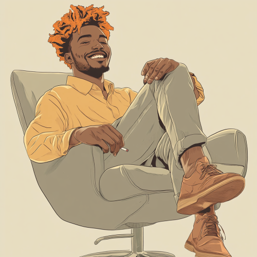 Illustration of a smiling man sitting in a simple chair with his legs crossed. The young, cool man holds a cigarette in his hand. Illustration of a full body, not fully seen. His hair is orange with an outside curl. He is wearing a shirt with the sleeves rolled up. Composition seen from a slightly oblique angle. The length of the man's legs stands out in this cool illustration. --ar 3:5