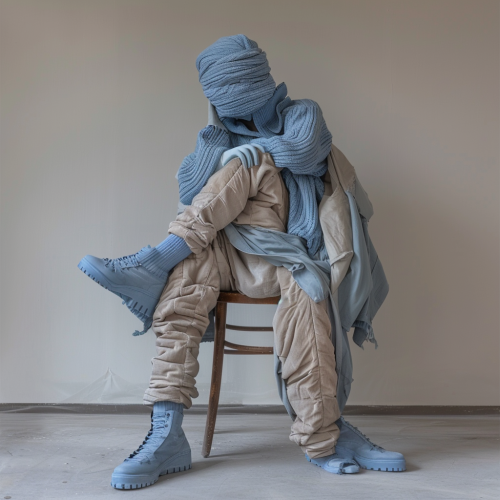 image of a chair holding a blue sweater, blue pants and blue shoes is a portrait of a man, in the style of minimal sculpture, crumpled, deconstructed tailoring, layering of hues, gloomy, neo-plasticist, dark gray and light brown file:///Users/pablovilches/Downloads/WhatsApp%20Image%202023-08-08%20at%2013.51.28.jpeg