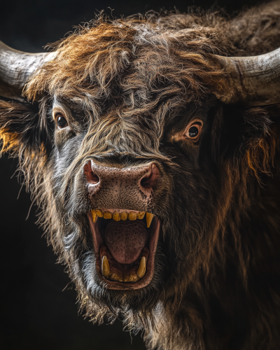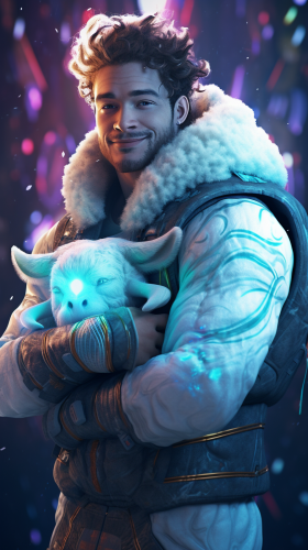 Beautiful man, smiling, comfy clothing, fluffy bull creature standing behind him, cyberpunk, supervillain vibe, colorful lighting, stars behind, half body, 4k, Cinematic Lighting, VFX --ar 9:16