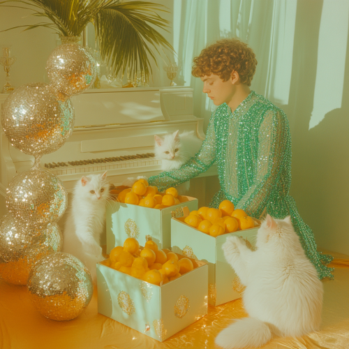 a photo in the style of Javiera Estrada, of a man in a beaded green dress, unpacking three boxes filled with oranges, white fluffy kittens at his feet are playing with shiny chrome balls, there is a white piano with a giant palm tree on it --chaos 11 --v 6.1 --p 924polm