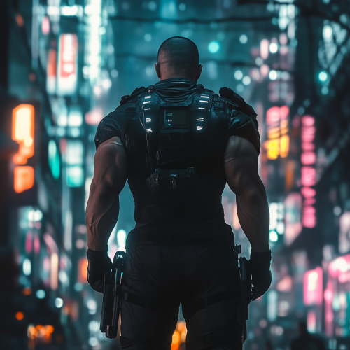 tall badass man, muscular, walking through futuristic city street, sci-fi hero, view from behind, looking over his shoulder, rugged, mature, handsome, dark futuristic clothing, cinematic, dramatic lighting