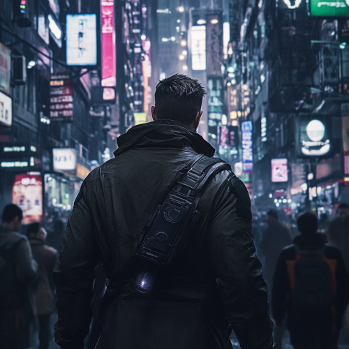 tall badass man, muscular, walking through crowded futuristic city street, sci-fi hero, view from behind, looking back at camera over his shoulder, rugged, mature, handsome, dark futuristic clothing, cinematic, dramatic lighting