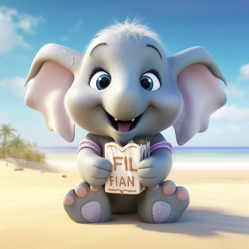 Smiling, happy, cute, 3D, realistic, cinematic, elephant, big cute eyes, cuddly, soft, fluffy. on the beach, Adorable, and detailed. holding a heart with text that says "FIA"