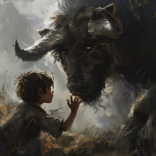 young boy telling a fake story lie about a bull-wolf creature. the creature exists as a background thought. --v 6.0