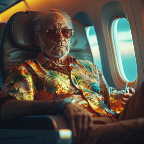 a man in an airplane seat relaxing. He is wearing a hawaiian shirt and sunglasses. He is smiling. He is sipping on a tropical drink. Intricate design and details, surface detail, light leak, bright, depth of field, cinema photography, cinema, beautiful colour grading, professional colour grading, Exquisite detail, realistic photography, hyper realistic, unreal engine, real lighting, 8k, detailed, photography, Super Resolution, Megapixel, ProPhoto RGB, Global Illumination, unreal engine, photo - realistic, wide angle, 8k, Megapixel, shot on Nikon D850 DSLR camera F2. 8 --v 6.0 --style raw --s 250