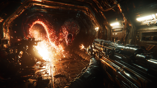 In the abandoned ship's cabin, a group of fully armed Marines opens fire with submachine guns. Ahead of them is a monstrous creature, a fusion of a car engine and a giant worm, spewing black smoke. Sparks fly as bullets strike the creature. The atmosphere is dark and ominous, captured with Rembrandt-style cinematic lighting, as if shot on an ARRI camera, creating an intense horror movie vibe --ar 16:9 --q 2 --s 250 --seed 594234596