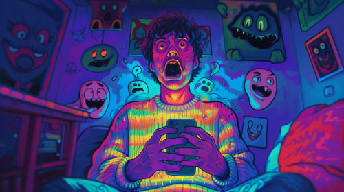 a cartoon-style room drenched in internet relics, featuring an exaggeratedly frightened man in a sweater his face rapidly being sucked in his phone, like a vortex. He is becoming one with the algorithm. He resists in a state of comic horror, surrounded by detached cartoon emojis and eyes, in vibrant colors and a dynamic, wacky composition --ar 16:9 --v 6.0