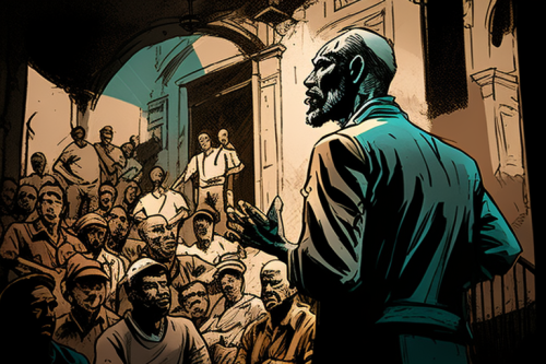 Cuban pastor speaking to crowd, cyanoscale, Cuban neighborhood background, dramatic, theatre, drama, in the style of Alphonse mucha and Caravaggio --ar 3:2 --v 4