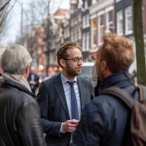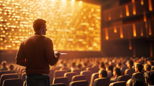 An realistic image of a businessman publically speaking to audience --s 150 --ar 3:4 --c 5 --v 6.0