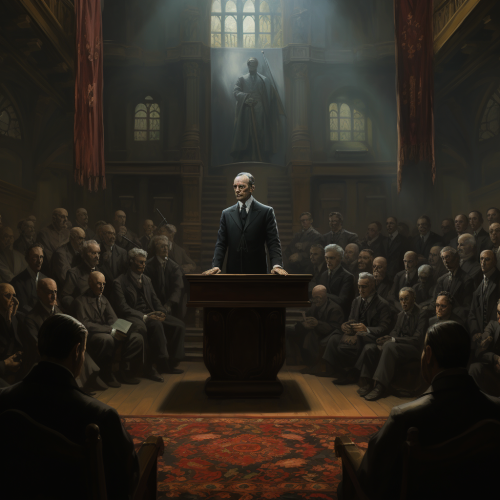 black and white old photo of a man in a suite with a goat and demonic face and horns speaking behind a lectern on a microphone giving a speech and pointing with his finger, you can see that he has a poster with illuminati and satanic signs.