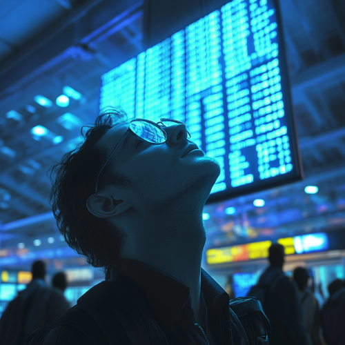 High contrast image of a man silhouetted against the vast digital departure board. The only visible details are his silhouette and the vibrant, colorful listings. Futuristic aesthetic with bold lighting, emphasizing the anticipation and boldness of his journey. --s 50 --style raw
